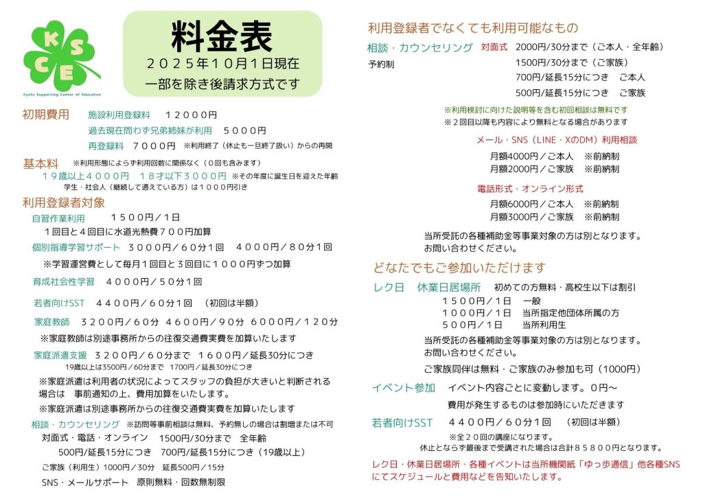 通常学習コースの授業料金表です。毎月末日締め、翌月5日ごろ請求となります。京都教育サポートセンターの学習支援の費用と同額です。一番下に京都教育サポートセンター料金表も掲示しておきます。